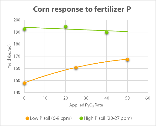 Figure 1. Average corn response to fertilizer P on high P soil vs. low P soil (Leikam et al., 2010).